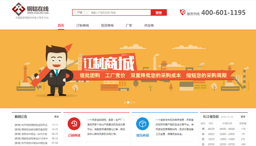 銅鋁在線是洛陽銅創(chuàng)電子商務有限公司傾力打造的銅鋁有色金屬電子商務交易平臺。在互聯(lián)網(wǎng)+背景下,做為國內(nèi)首家銅鋁材料在線交易平臺,銅鋁在線以互聯(lián)網(wǎng)思維為指導,致力于變革有色金屬生產(chǎn)、流通、經(jīng)營模式,拓展有色金屬市場,助力有色金屬行業(yè)轉型升級。